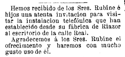 - Expediente 87/1885: oficios comunicando a concesión da autorización polo Director Xeral de Correos e Telégrafos a favor de Rubine e Hijos para establecer unha liña telefónica particular entre a súa fábrica na Avda de Riazor 6 e o seu despacho na Rúa Real 81.